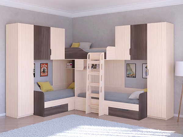 Трехместная кровать с полноценными спальными местами стала еще вместительнее. Два больших шкафа с каждой стороны позволят разместить теперь точно все вещи Ваших детей. Размеры спальных мест 80х190