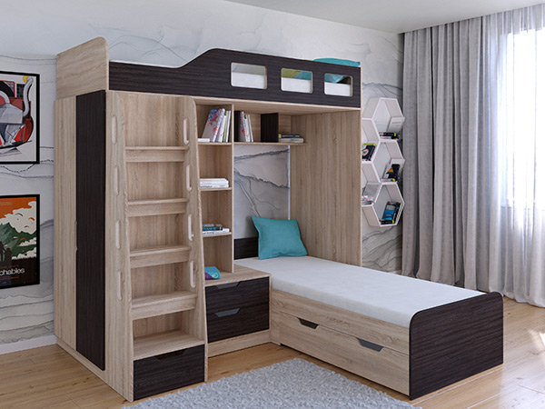 Двухъярусная кровать Астра 4 для двоих детей имеет необычную конфигурацию. Верхний ярус расположен стандартным образом и попасть туда можно при помощи боковой лесенки с удобными прорезями для рук. Верхняя кровать имеет надежное ограждение для безопасности спящего ребенка, а лесенка — дополнительный выдвижной ящик. Нижняя кровать двухъярусной кровати Астра 4 имеет нестандартное решение. Обычно обе кровати располагаются одна над другой, но здесь вариант получился не менее выигрышным. Кровать снизу расположена перпендикулярно верхней, за счет чего двухъярусную кровать можно поставить в угол. В изголовье расположились открытые полочки для книг и игрушек, а снизу два вместительных ящика в качестве прикроватной тумбы, на которую удобно поставить лампу для чтения. Нижняя кровать также снабжена вместительным выкатным ящиком для хранения игрушек или постельного белья. В боковой части двухъярусной кровати Астра 4 есть встроенный вместительный шкаф для одежды, который дает возможность привить детям аккуратность, убирая свои вещи в положенное место.
