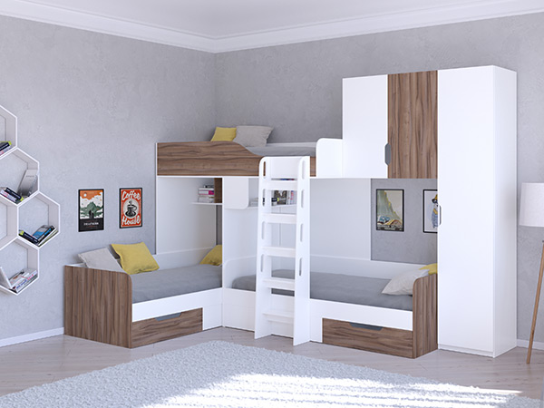 Трехместная кровать с полноценными спальными местами стала еще вместительнее. Выберите расположение шкафа с любой стороны. Размеры спальных мест 80х190