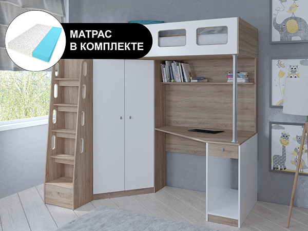 Кровать чердак АСТРА 7 Сонома с беспружинным матрасом