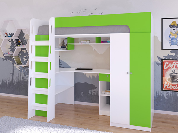 Кровать-чердак Астра 10 от компании РВ Мебель представляет собой функциональное решение для организации пространства детской комнаты. Она сочетает в себе спальное место, рабочую зону и систему хранения. Конструкция выполнена из экологически чистых материалов, отличается надёжностью и удобством эксплуатации. Верхнее спальное место оснащено бортиком и лестницей, нижняя часть включает письменный стол, шкаф и полки, обеспечивая комфортное пространство для учебы и отдыха ребенка. Дизайн модели лаконичный и современный, подходит для интерьеров в стиле минимализм и скандинавского стиля.